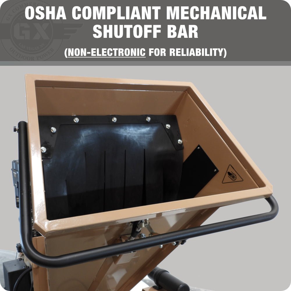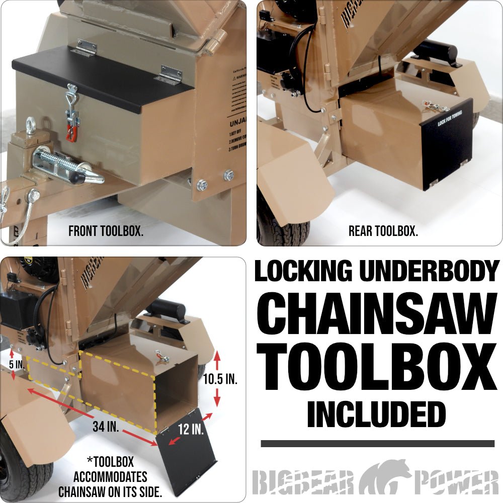 The GX Commercial BigBear Power 15 HP 5-inch wood chipper is designed to simplify your work with its high-torque dual shiv V-belt Ultra race clutch drive and enlarged main feed chute that handles full trees hands-free. Featuring Tornadic Drum technology and Super Steel tool steel blades, this machine delivers exceptional commercial performance. It includes an OSHA-compliant shut-off bar, onboard chainsaw toolbox, front storage toolbox, Flip and Stow towbar, fenders, D.O.T 45 MPH tow package, ATV reinforced off-road axle, and a quick drop and lock stand for ultimate convenience and safety.