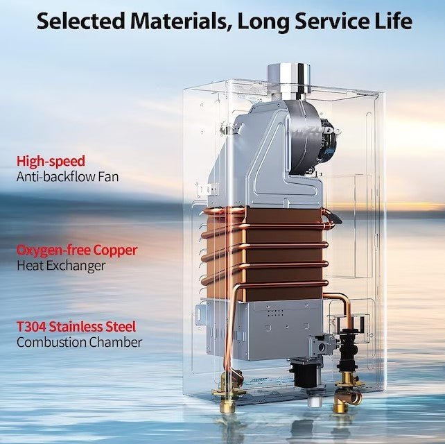 The Mizudo indoor tankless water heater is a compact, efficient solution for small homes, apartments, and cabins, delivering 4.3 GPM of continuous hot water with 100,000 BTU. Its sleek design includes a touch panel LED display, supports simultaneous water supply for 2 to 3 water points, and precise temperature control. The heater features an oxygen-free copper heat exchanger for durability, and a high-speed anti-backflow fan. With over 50% space savings compared to traditional heaters. Specifications include 120V power, and wall-mounted installation.